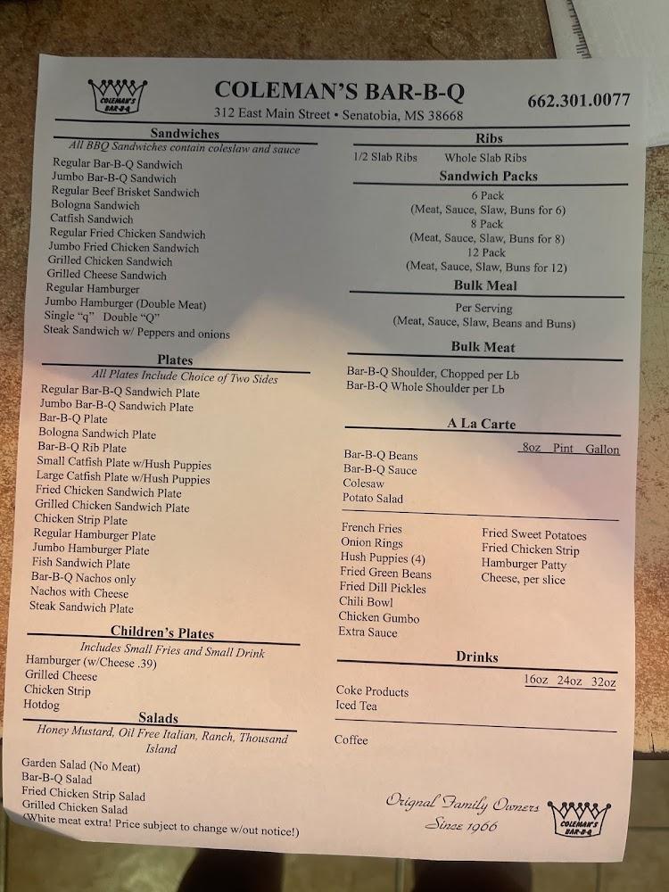 Welcome to Coleman's Bar-B-Q, LLC, the last remaining gem of a franchise that has been delighting taste buds since the 1960s! Located at 312 E Main St in Senatobia, MS, we offer a mouthwatering menu featuring traditional barbecue and local specialties. With a relaxed, historic ambiance, our restaurant is perfect for breakfast, lunch, or dinner, whether you're dining solo or with a group. Enjoy our excellent café and wide selection of teas while taking advantage of our convenient takeout, delivery, and catering services. Join us for a memorable meal in a space that's accessible and inviting for everyone!