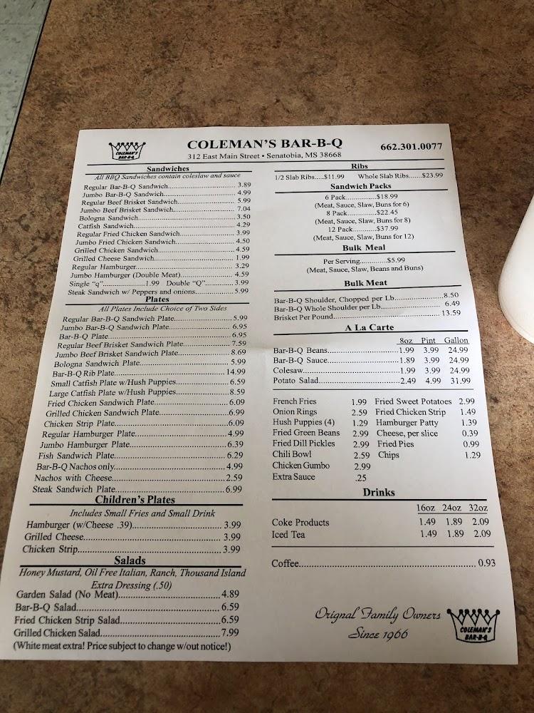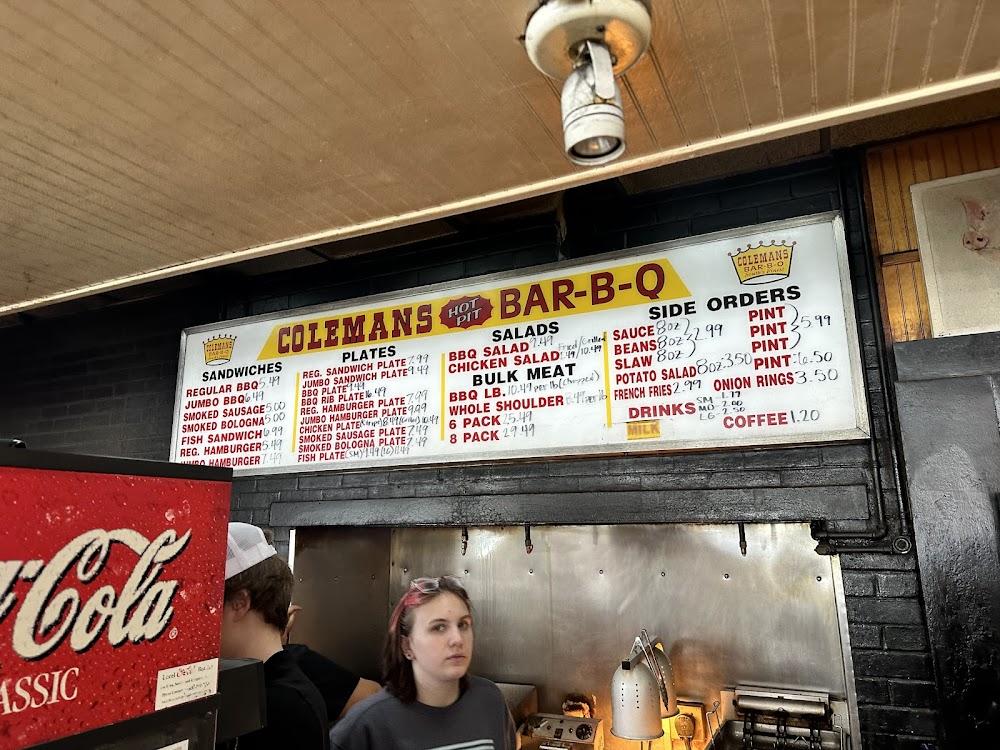 Coleman's menu showcases classic Southern BBQ with items that cater to diverse preferences. Breakfast shines with choices like egg sandwiches and grits. Lunch and dinner feature scrumptious BBQ options including pulled pork and ribs. Each item, seasoned well, promises a delightful taste journey. Prices remain budget-friendly, ensuring everyone can enjoy a rich dining experience without breaking the bank.